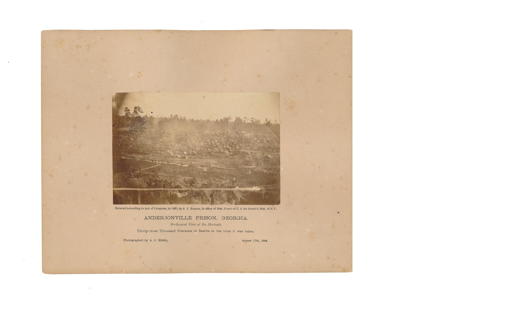 Printed inscription on bottom of mount reads, “ENTERED ACCORDING TO AN ACT OF CONGRESS, IN 1865, BY A.J. RIDDLE, IN OFFICE OF DIST. COURT OF U.S. FOR SOUTH’N DIST. OF N.Y. / ANDERSONVILLE PRISON, GEORGIA / NORTH-WEST VIEW OF THE STOCKADE / THIRTY-THREE THOUSAND PRISONERS IN BASTILE AT THE TIME IT WAS TAKEN. / PHOTOGRAPH BY A.J. RIDDLE, AUGUST 17TH, 1864”.
