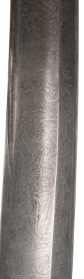 The blade is in the bright above the etched panels, with good edge and point, and shows just slight freckling and some very small gray spots between the end of the fuller and the tip. The scabbard is likewise bright, with drag, bands, and screw-fastened throat in place. We see one small ding and just scattered small gray spots.