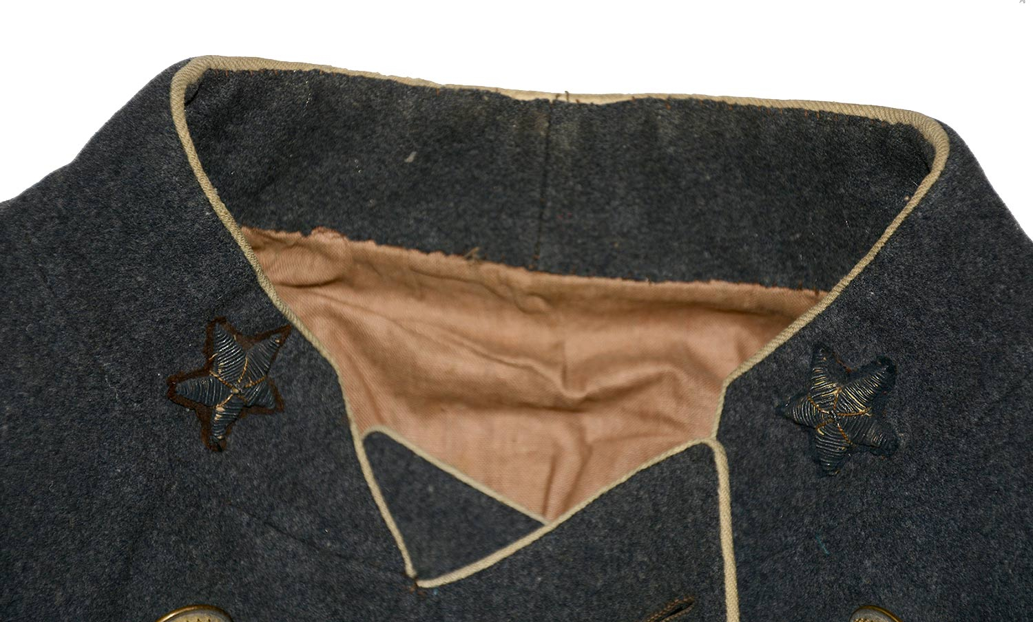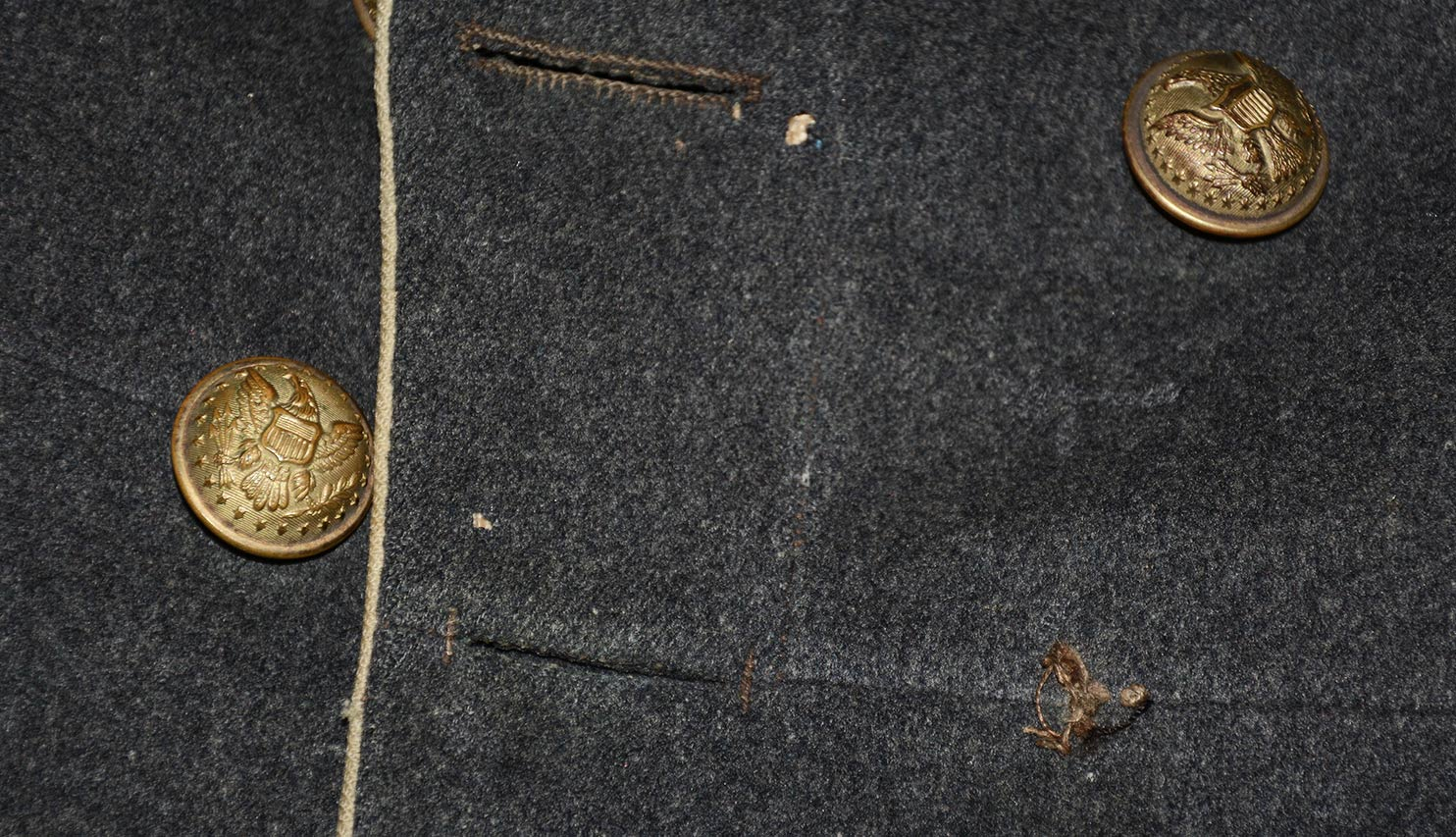 Haines’s coat comes with a 1998 letter of authenticity and analysis by Confederate uniform and textile authority Les Jensen, whose report we borrow from extensively in the following. The coat is in excellent condition, solid, with strong color, and just scattered small moth holes that need no repair for conservation or appearance. The only sizable missing fragment we see is a 1-inch square on the edge of the unhemmed skirt on the wearer’s right. The only seam opening is a small section at sleeve top on the wearer’s left shoulder that could be closed. The coat is dark gray wool, double breasted with seven US staff buttons in each row on the chest. The standing collar rises to 1 5/8 inches at its tallest and is piped with a narrow rolled buff or white material along its upper edge. A single star made of silver metallic braid on a dark blue or black background and measuring about 1 1/8 inch is tacked to either side of collar indicating the rank of major. The edge of the coat is piped with a buff or white 1/8 inch wide rolled cloth border like that on the collar. The sleeves are typically wide for the period, about 10 inches at the elbows and the cuffs much narrower, about 5 ¾ inches, non-functional, each with three small US staff buttons, and bearing a similar piping, but unrolled and ½ inch wide running around the back of the cuff about 2 inches above the bottom and rising as an inverted chevron or pointed cuff to about 3 ½ inches on the outward side. Running over that stripe are flat strands of gold braid, each 3/16 inch wide, originally three strands on each sleeve indicating a field officer, but with one now missing from the left. These rise above the cuff chevron to form regulation galloons or “Austrian knots,” with two narrow loops at the bottom, overlapping larger circles at the midpoint, and tall pointed loop at the top, extending just above the elbow on each sleeve. The rear of the coat is cut in the conventional style with false pockets on the skirts with flaps piped in white, like the front of the coat, lined in brown cotton with a white dot and star pattern on the underside. Two buttons are missing from the rear waist, but the two marking the ends of the pocket flaps are present and are US staff buttons like the others on the coat (all are a mix of “Extra Quality” and “Superior Quality” back marks.)