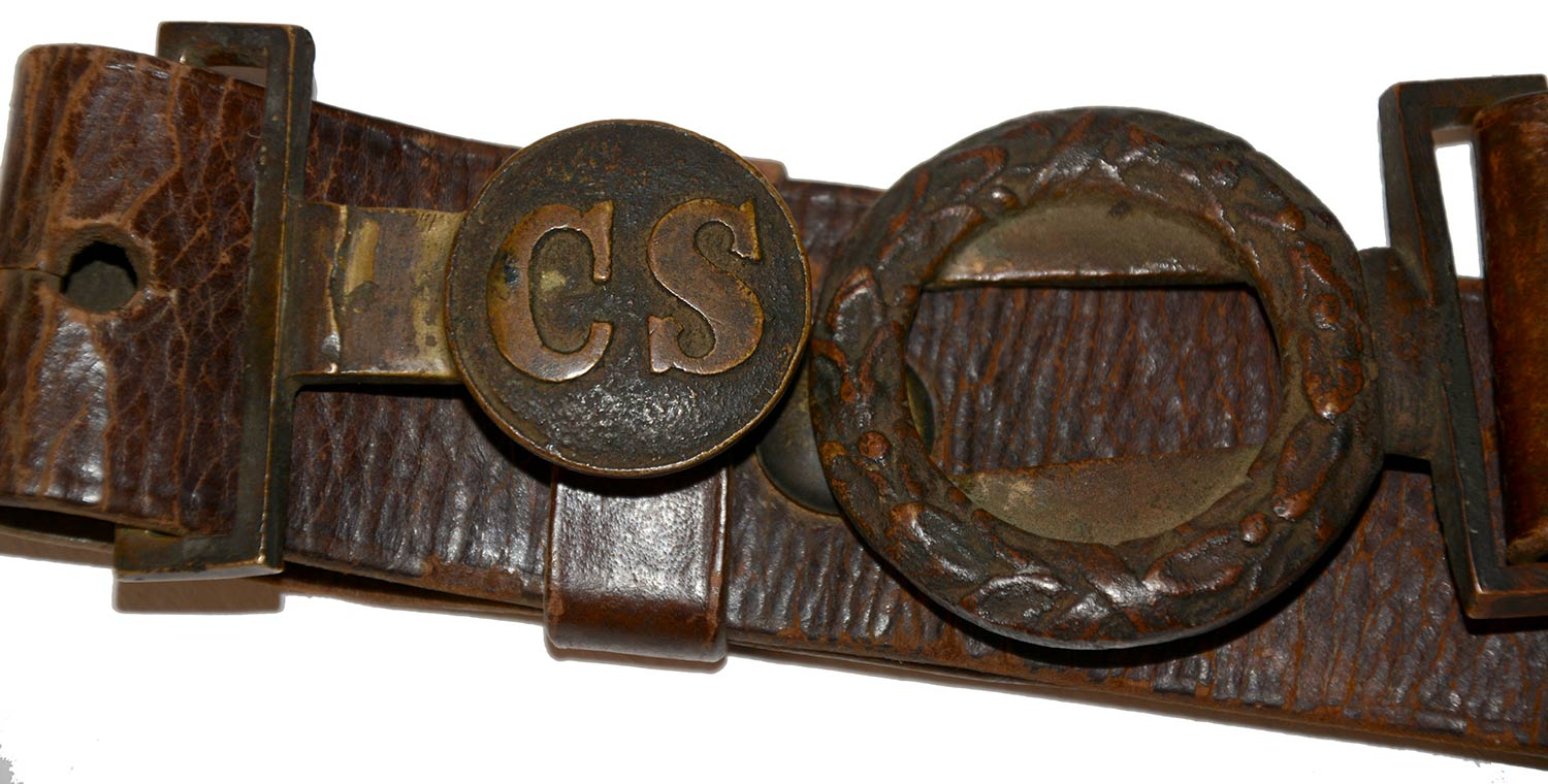 Haines’s sword belt is brown leather 1 ¼ inches wide with a narrow, impressed border and carries a two-piece interlocking C.S. belt plate in the Richmond style with straight serifs on nicely formed letters on a stippled background with a narrow border on the tongue disk with a sharp step up to the bar and beveled edges to the loops. The plate is in excellent condition with a nice, untouched patina. The belt shows minor wears spots and wrinkles from flexing and has a partial tear that should be repaired or stabilized about five inches from the wreath end of the belt and a glued patch repair on the interior about two inches behind that. The leather is supple, with smooth surface and good color. The wreath portion of the belt plate is sewn in place with typical Confederate bullet-shaped stitching. The loose end runs back through the side loop of the CS tongue and is adjusted by simple double-ended brass stud like those used on a saber slings, and has a single sliding loop. Stitching holes show that it once had sword slings sewn in place on the wearer’s left. The forward sling, likely with a carrying hook, was sewn in place with rectangle of stitching. The rear sling was attached with a vertical oval with pointed ends. No preservatives, polish, or leather dressing has been applied to the leather and the patina of the plate is untouched.