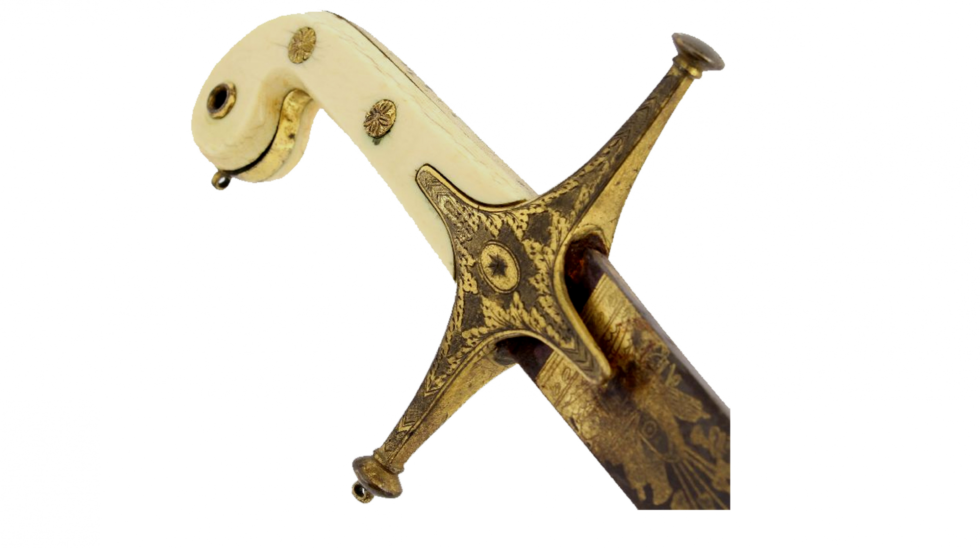 Tri-color blade - blue, gold and "white" of flat design. Ship's Mast, American Eagle, Standing Indian figure and engraving of Indian with headdress. Flat slab ivory grips with beveled edges held in place with floral design "rivets". Guard has detailed, quality engraving of the English style. Original chain guard (knucklebow) is missing but attachment loops are present. Sheet brass scabbard with heavy gilt and two carry rings with bands around the scabbard body. [ph:L]