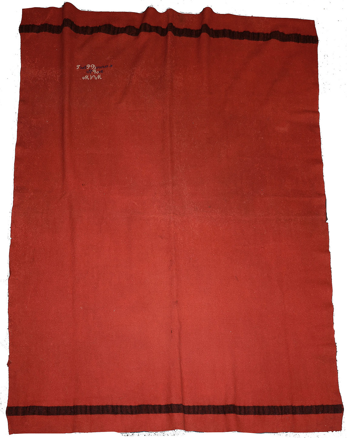 Any Civil War issue blanket is scarce, and red examples particularly so. This one is in excellent condition, with strong color, red with black end stripes, and the fabric showing only some scattered very small holes. It measures 58 inches by 80 inches, and has the soldier’s name and unit embroidered at the upper left, below one end strip, in letters 1” and ½” tall, reading: “Theo P Bowker, Jr / 13th Reg / MVM.” Most of the letters are in dark blue, with the initial letters in script and in white, as is the “MVM,” creating a patriotic red, white and blue effect, with the ends are bound in a narrow, lighter blue. The embroidery, and perhaps the edge binding, was likely done by a loved one at home, if not by Bowker or a comrade. Bowker was a member of Company A, which had been Company A of the 4th Battalion of Rifles, Mass. Volunteer Militia. The company was the old Boston City Guard, which split off from its old regiment in December 1860 and formed the nucleus of the 4th Battalion, which in turn became the nucleus of the 13th Mass. Regiment. Whether Bowker was long-time member or recent recruit enlisted to bring the company up to war strength is unclear: his date of muster is July 16, the official date of muster into US service for the entire regiment. Company A and the rest of the 4th Battalion had been in garrison at Fort Independence, Boston harbor, from May 25, 1861, while the regiment was organized and drilled, until its departure for the front on July 29. Company A likely had it blankets already when it entered the fort: the first companies were noted as carrying knapsacks and blankets. But, in listing the items issued at the fort the regimental history includes blankets and notes that soldiers were responsible for any items lost: “as you had to pay for the articles issued, there was no objection on the part of the government to your throwing them all away, if it pleased you to do so…” There was thus lots of incentive to mark one’s gear to prevent theft or loss. That the regiment’s blankets were red is specifically stated in the regimental history, noting that they had settled into a camp at Boonsboro, MD, in August after dark and, “When reveille was sounded, and our eyes opened, we looked about to see where we were and who were near us. The bright red blankets of the regiment made the place look attractive.” This is a passing reference in a humorous anecdote since it also became clear in the daylight that the attractive camp had been in fact been made in a mule yard.
