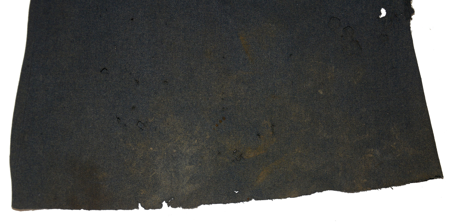 This unidentified overcoat is single breasted and was fastened by 6 buttons down the front (five remain). The second and sixth are script Confederate infantry "I" made by S. Isaacs Campbell & Co. The third is civilian and made of bone. The fourth is a Virginia state seal made by Horstmann in Philadelphia before the war while the fifth is a Yankee eagle button. All appear to have been sewn with matching cotton thread at the same time and all have matching patinas. There is a two-piece belt on the rear waist adjusting by 2 buttons. One remains, and it is a script "I" made by Isaac Campbell & Co.