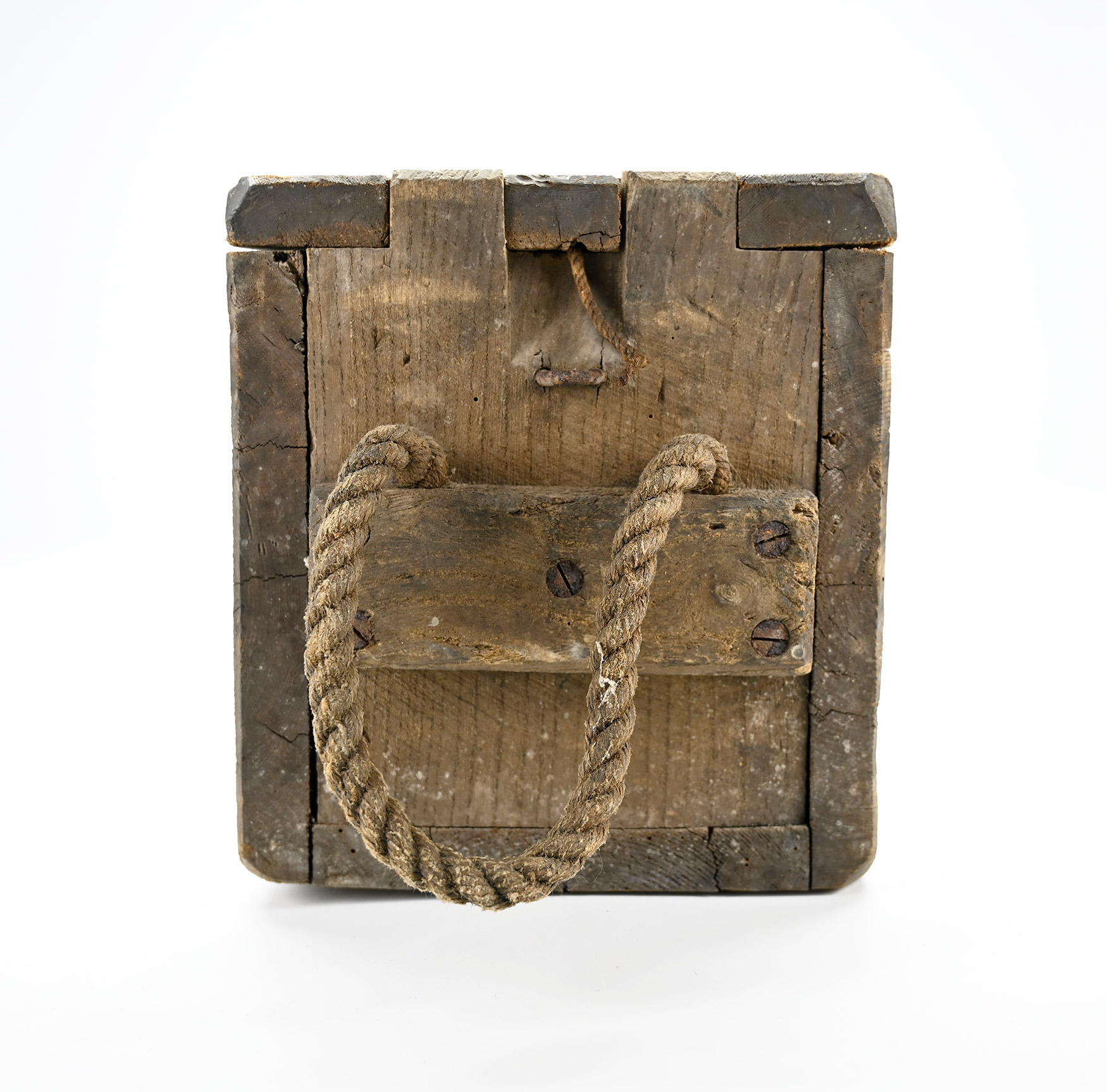 This is one of several scarce British artillery crates that recently came to hand, some of which were marked “Quebec.” Along with other ordnance and shipping markings, this is clearly stenciled at the left end of one side: “BOXERS DIAPHm / SHRAPNEl SHELLS / 32 Pd GUN OR HOWr” indicating it contained case shot, called “shrapnel” shells in honor of its inventor, Henry Shrapnel, with “Boxer’s diaphragm,” another improvement in lethality for British artillery, and that the shells were for 32-pound guns or howitzers. Boxer’s innovation was two-fold: first he enclosed the bursting charge for the shell in a tin container so the powder would not mix with the bullets inside the shell, preventing duds or premature explosions; he then improved upon this by adding an iron “diaphragm” to the shell’s interior to contain a bursting charge in a thinner walled section of the shell, serving to still break the shell casing as it approached the target, but not so widely scatter the bullets or shot inside.