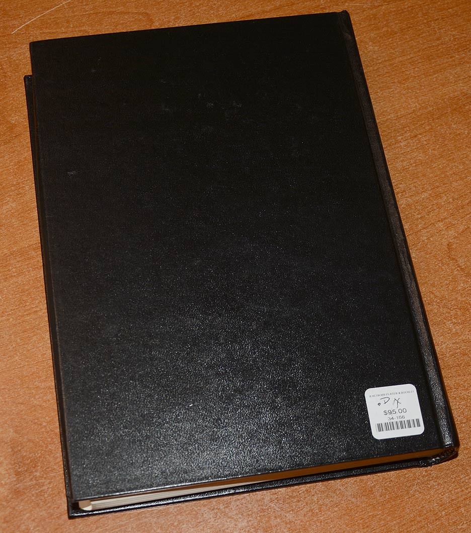 Black hardcover with gold embossed lettering and decoration on the cover. Gold lettering on spine.