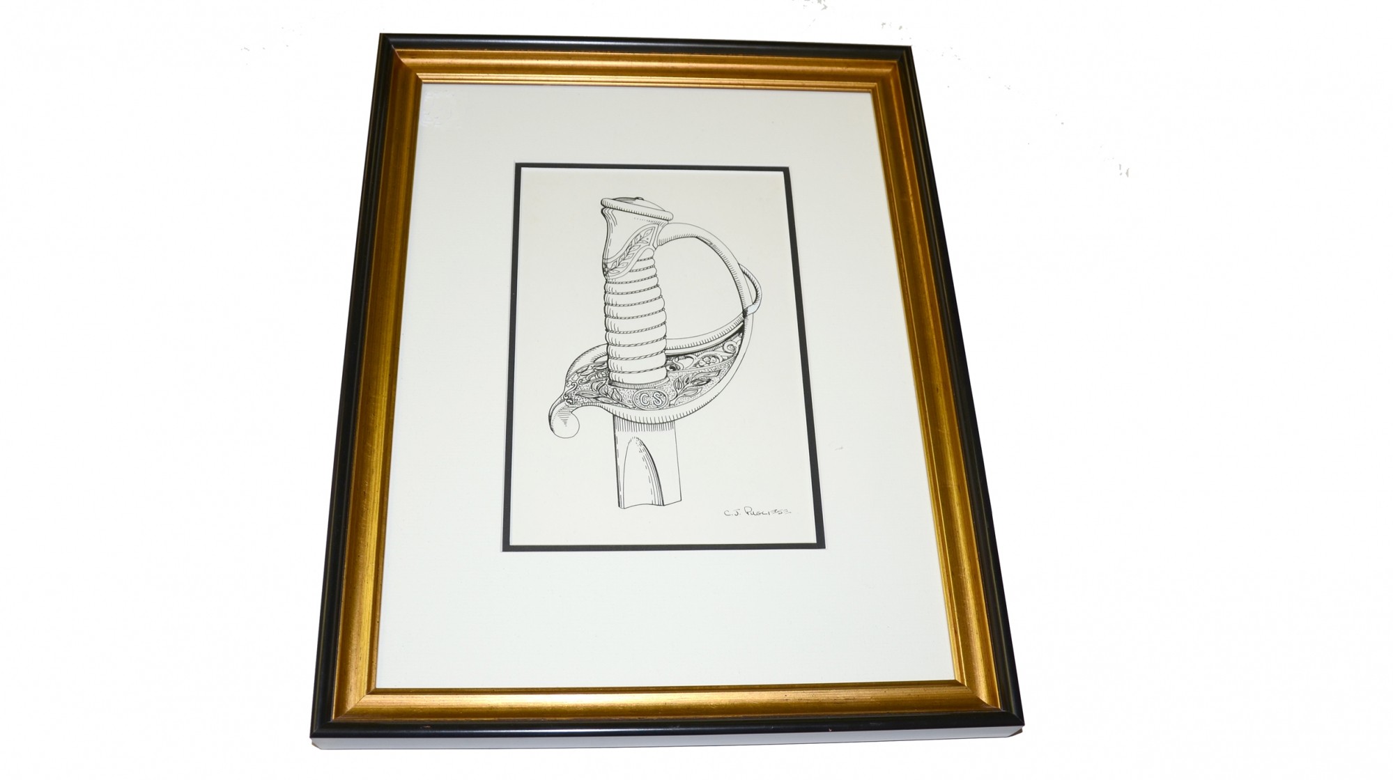 This original engraving by well-known military artist C.J. Pugliese features a close view of the hilt of a Confederate sword with the “CS” showing at the front. Image is clear and shows great detail. Pugliese signed at the lower right. Label on reverse states that this was from the collection of William A. Albaugh, III.