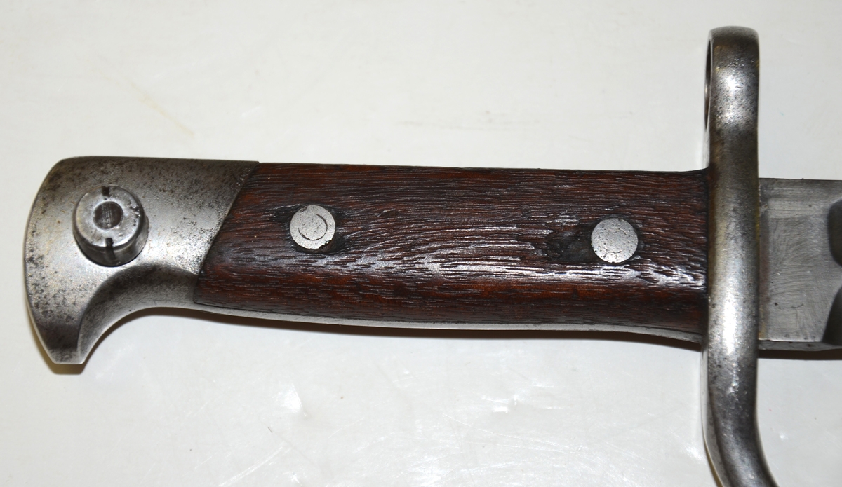 The Remington-Lee rifle of 1899 was an attempt to update and adapt their 1885 magazine bolt action rifle to the new .30-40 caliber smokeless ammunition used by the Krag. It was not adopted by the U.S. government, but military models did make their way into the hands of some foreign forces in various calibers. It was designed to take a knife bayonet similar to the Krag. This is very clean example with its scarce scabbard. The blade is bright silver gray and shows just scattered darker gray spots and flecks. The edge and point are very good. Unlike the Krag and Lee straight pull bayonets, however, the guard has a hooked lower quillon. The wood grips are tight to the metal and free of nicks or gouges. The pommel matches the guard in being light silver in color with scattered dark gray spots and smooth metal. The button and locking mechanism are fine. The scabbard body is black leather with blued steel throat and drag, pretty much identical to the first pattern scabbards for the Lee straight-pull bayonet, but with an early Krag style long open pivoting belt hook. The leather is in good condition. The metal has lots of original blue, but some brown spots on the face of the throat and on the belt hook, particularly on the reverse at the top and bottom bends.