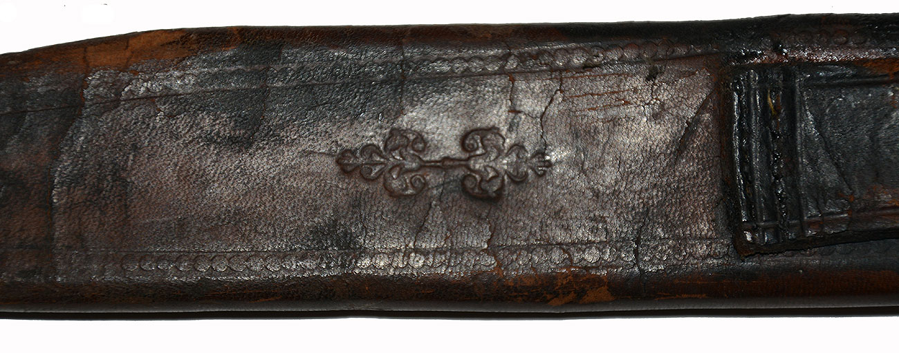 The scabbard is good, solid, brown leather, with seam on one side and belt loop on the other along with a impressed border and addorsed floral motifs at center. The seam is tight. The scabbard shows some minor rubs along the edges, tip, and belt loop, with some rubs and a spot of finish loss above the impressed floral design on the belt loop side.
