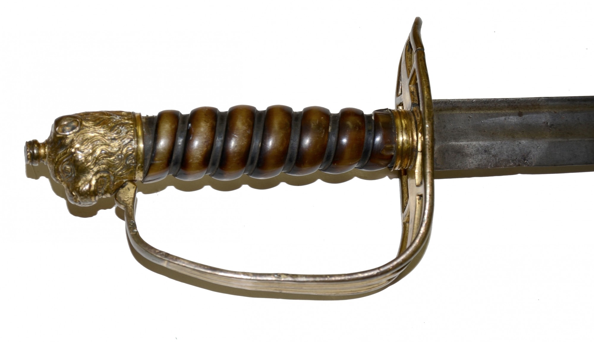 The one-piece grips are wood carved in a spiral pattern with no leather cover. Wood shows light shrinkage and a small sliver of wood missing at the pommel base and at the guard’s brass ferule. The brass Lion’s Head pommel has the capstan rivet but no top strap. Knucklebow narrows at the pommel and widens toward the guard which spreads into a 2” wide brass straight cross guard.