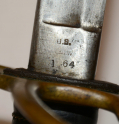 Classic Civil War cavalry saber made by Ames Manufacturing Company. Sword is in overall good condition. Blade is semi-bright with a few very minor edge nicks. Ricasso is stamped with a well-worn Ames & Co. maker’s stamp where only “CHICKOPEE” is visible on one side and “US” inspector’s initials and “18_4” on the other. Original leather washer remains in place.