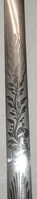 The blade is the 1834 configuration, straight, double edged with a central narrow fuller, and spearpoint tip. Both sides use floral panels, oak leaves and acorns and leafy vines in the etching to set off figural panels. On the obverse this is a small trophy of arms consisting of a bow, quiver and shield in a lower panel and in an upper panel a U.S. eagle with raised wings, arrows and olive branch, with E Pluribus Unum ribbon in its beak under a glory of stars and sun beams. On the reverse a tall central, figural panel shows a crossed pair of tall pikes with furled flags with a Liberty Cap on a pole rising above them at center with a burst of sun beams overhead. On both sides of the blade the frosting ends in flame-like leafy points. The scabbard is fitted with two carrying rings at top and one at the midpoint, all mounted by simple loops on the scabbard edge, but set off by floral and geometric engraved motifs. The drag has a button finial, cast in the form of a small flower bud with engraved, nested flowering shoots extending a few inches up the scabbard. As is usual, the reverse of the scabbard is plain, except for the stamped Ames address at top.