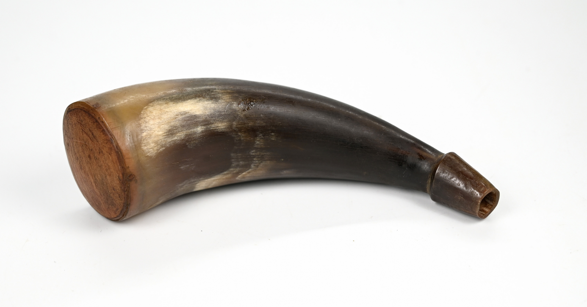 This horn dates roughly 1820-1850. It is a plain, working powder horn only about 5 ¼ inches long, a size sometimes thought to be just for priming powder for a flintlock, but convenient enough to be carried in a hunting bag or pouch by farmer not out for a hunting expedition or day of sport, but out to bag something for dinner and not about to waste powder doing it.
