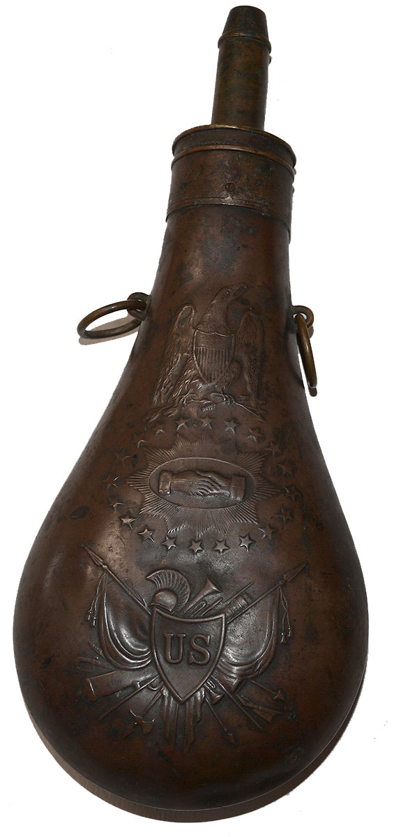 Robert Dingee had produced powder flasks for riflemen starting in 1832 and in 1837 Ames had taken over production, introducing a few improvements and changing the embossed motifs to the American eagle at top, the panoply of arms at bottom and the oval with a pair of clasped hands that likely symbolized fidelity, but gave rise to the nickname of “Peace Flask” among collectors, however contradictory that might sound for a rifleman’s powder flask. Batty produced this version from 1847 to 1858, by which time the 1855 series of arms was in production, older arms were being upgraded, and fixed cartridges with the new Minie ball had become the standard, though there was apparently some residual demand from militia groups who may have preferred traditional accoutrements and retained older arms. This would go well with an 1817 Common Rifle, Hall, even a Mississippi, or in an accoutrement or specifically powder flask display. [sr][ph:L]