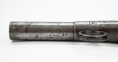 These small, unmarked, all-metal single action and singe-shot percussion pistols are the product of Bacon and Company of Norwich, CT, and manufactured in very small numbers from about 1852 to 1858, by Flayderman’s reckoning. This one is numbered “53” on the underside of the barrel, near the frame. They are .31 caliber and under five inches overall, this one has a barrel just 2” long, making them a perfect pocket pistol or deringer, robustly constructed – made completely of iron with the bag-shaped grip cast integral with the frame on the right and with a removable, screw-fastened panel on the left, and fitted with a ring trigger to avoid using a separate triggerguard, make it easier to draw from a pocket- though the hammer might still hang up- and possibly serve as an iron knuckle in a clenched fist if it came down to it. This shows as a muted silver and gray in color with mixed areas of darker gray staining and “freckling” or shallow pitting. The mechanics are good, as is the bore. The nipple has been battered a bit from the impact of the hammer.