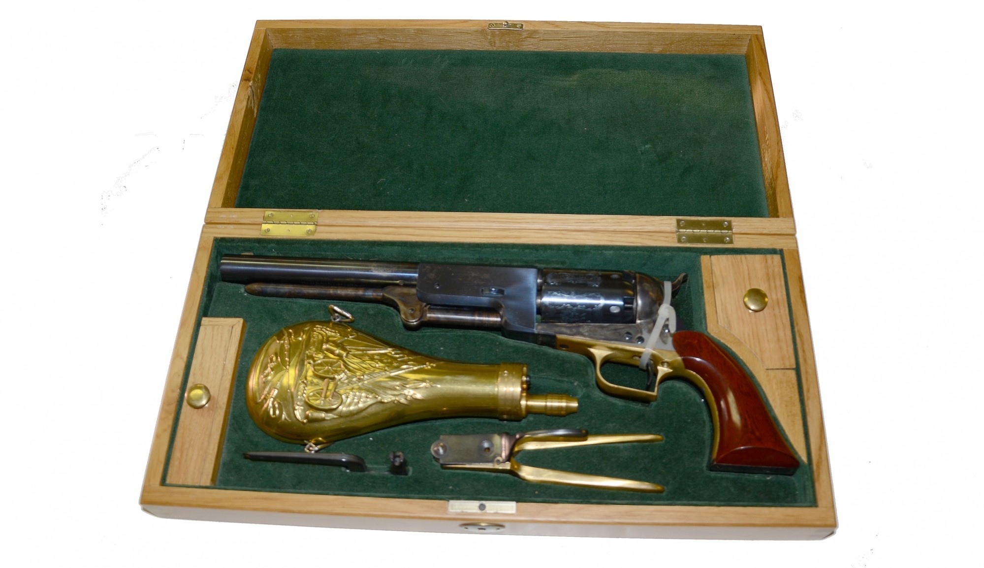 This modern reproduction horse pistol is an excellent condition, cased, presentation .44 caliber Colt Walker six-shot revolver produced by the A. Uberti Company in Italy. The revolver comes housed in a very fine blonde-wood, modern two-piece, lockable, hinged box fitted with a large brass powder flask, a brass-mounted bullet mold, and a combination tool wrench. Interior box is custom-molded to fit the individual handgun and accoutrements and covered in a vibrant green velvet material. Box interior also exhibits two small inner compartments, one for the lock key, and one for lead bullets, not included. The large, heavy revolver retains almost all of its bluing and shows fine case colors on the frame, and the loading lever.