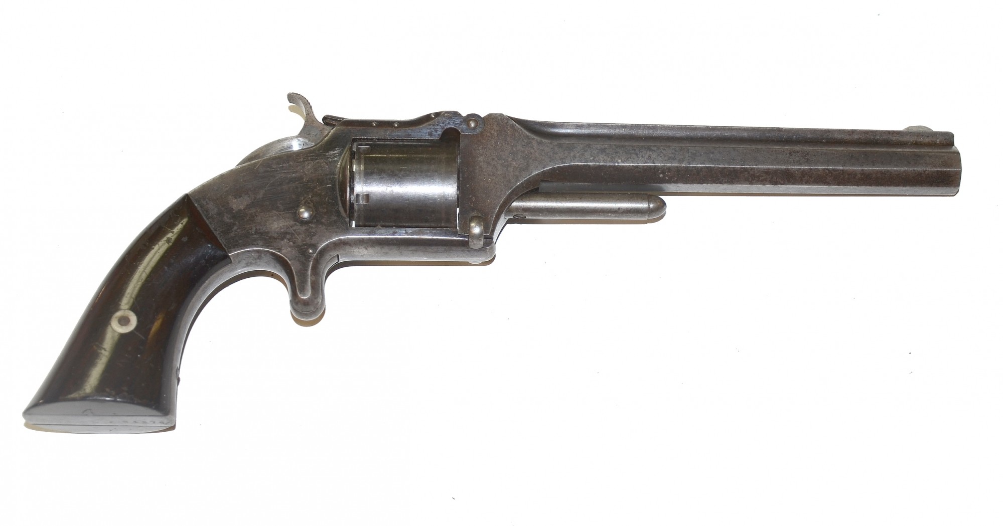 The Model #2 was manufactured from 1861 to 1874 with a total production of 77, 155 revolvers. Revolvers with serial numbers under 35,731 are considered to be civil war guns since they were manufactured before May 1st, 1864. They are all 32-caliber rimfire with a six shot non-fluted cylinder. Most have a 5’’ or 6” octagon barrel but a few had 4”, 8” or 10” which are rare. All were manufactured with rosewood grips and blue or nickel-plated finishes. The barrels are marked SMITH & WESSON. SPRINGFIELD, MASS. The patent date is stamped on the cylinder and the serial number is on the butt.