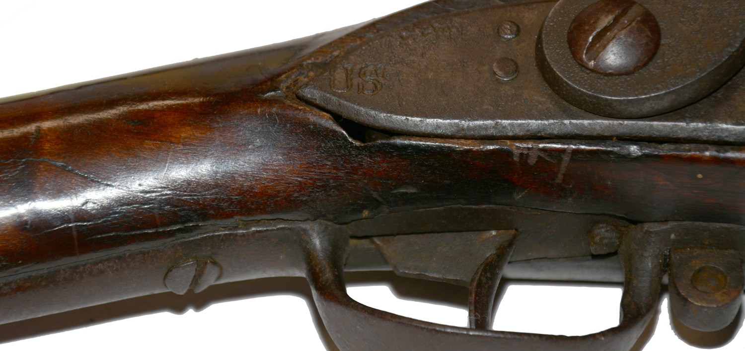 The stock has a nice, untouched, aged patina, with typically nice French contours, intended to help lighten the musket, particularly in the molded and carved buttstock with a deeply fluted, raised comb, producing a prominent handrail. The iron buttplate fits well. The stocks has good color and surface, though with handling marks, very old, shallow scrapes, etc. The lock apron has good edges, but does show a chip at the front, a little shrinkage and chipping at the upper rear, and chip at lower rear where the mainspring likely slipped and struck the wood. The surface of the lock is fairly smooth, gray in tone with some light pitting, matching the hammer. The markings are good, especially for a musket passing through Federal hands where the metal was often aggressively cleaned before application of the US stamp. The barrel is generally smooth, brown metal with some thin crustiness along the edge next to the forestock and corrosion around the breech that is shared by the flash pan and frizzen. There one small, short gouge forward of the D stamp, and there is little shrinkage around the breechplug tang. The edges of the side flat are good, though with usual narrow gaps around the side plate.