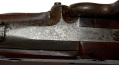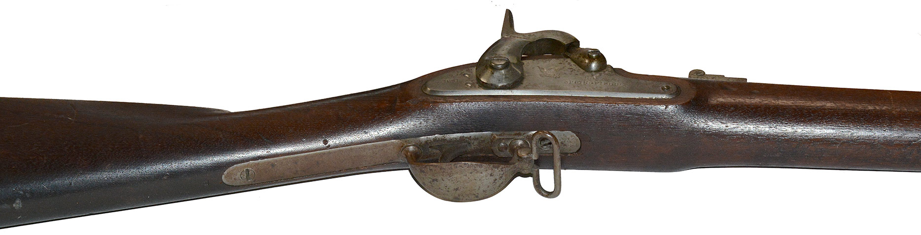 The rifle was clearly issued and used. The breech shows shallow pitting from firing corrosive percussion caps. This has spilled over slightly to the upper lock plate around the lower edge of the bolster and on the barrel forward to the rear sight and back to the breechplug tang. Nevertheless, the lock markings are very good, with a crisp 1861 date, US/Springfield stamp, and nice Springfield eagle showing just a bit of rubbing on the chest. The barrel date is also “1861.” The last digit is partially obscured by the pitting, but in the right light the vertical stroke of the last digit is pretty clear. The V/P/[eaglehead] barrel proofs are rubbed, but clear. The rear sight leaves show corrosion, but have visible range marks. Forward of the rear sight the metal is smooth, silver gray, with some gray and brown staining. The screw show staining, but are all very good, with crisp slots. Only the vent screw slot shows any sign of turning and that is pretty mild. Mechanics function very well; rifling is strong but the bore is dirty and exhibits some pitting from half way down and beyond.