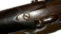 Barrel is 40” long with front blade sight mounted on barrel band and no rear sight. Bayonet lug is mounted under the muzzle. The breech is moderately pitted and only portion of the date, “VP” and eagle head remain visible. Bore is clear but needs cleaning.