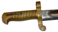 The Whitney Model 1861 Navy Rifle was the brainchild of John A. Dahlgren, who began developing it in 1856 and undertook testing on an 1858 voyage of the USS Plymouth, which served to test naval ordnance and gave the rifle its nickname. Dahlgren wanted a large-caliber short rifle for shipboard use that used a heavy barrel to compensate for the recoil and might carry a Bowie-knife style bayonet that would be useful has a hand-held weapon and for other shipboard tasks. As fully developed and produced by Whitney on a July 1861 contract, the rifle was somewhat lighter than Dahlgren wanted, but mounted a 34-inch .69 caliber rifled barrel secured by two bands, with a long French style rear sight graduated to 1,000 yards. Dahlgren’s Bowie knife bayonet was given a life of its own, and the rifles were instead supplied with a brass hilted sword bayonet made by Collins and carrying a long 22.5 inch blade to make up for the rifle’s short barrel in close combat against musket-armed opponents.
