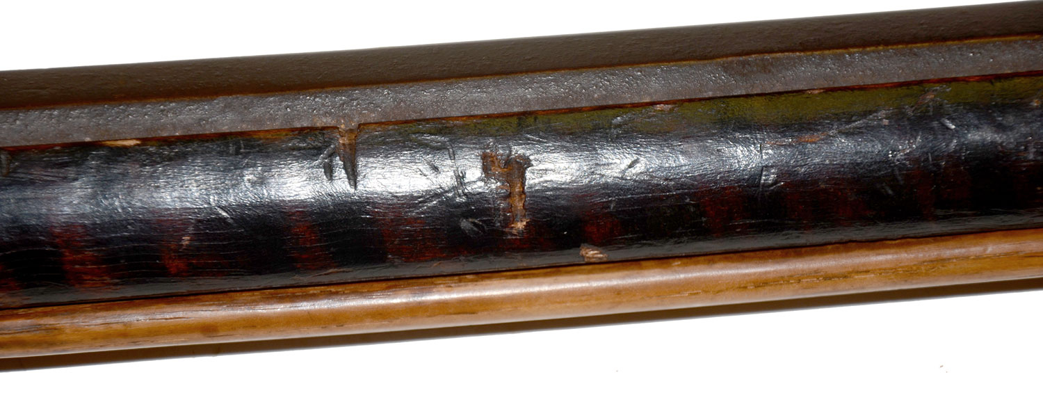 Ramrod is wooden and is complete but does have a large gouge approx. 8.50 inches long just below the midpoint of its length. Turning the rod in the three brass pipes will hide this imperfection. [ad] [ph:L]