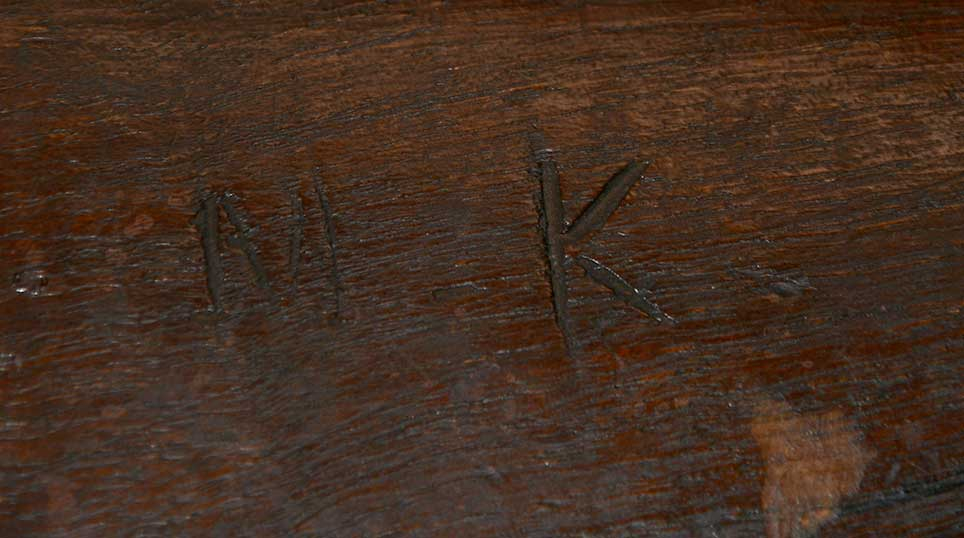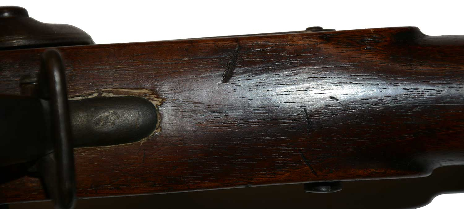 The wood to metal fit is good. The counterpane and lock apron have good edges, though the latter shows a hairline at rear center with some dark residue behind it indicating it may have been repaired at some point and two other hairlines or draglines on the left forestock at the middle band, also with some dark residue indicating a repair, perhaps of a shallow chip. Other than that the wood shows just typical handling dings and light scratches with scattered stains though with a set of initials lightly scratched into the right buttflat reading “M K.” These are likely the soldier’s initials, but are not enough to narrow it down much in identifying it. Other handling marks are not severe but enough to obscure marks on the comb or belly of the stock.