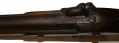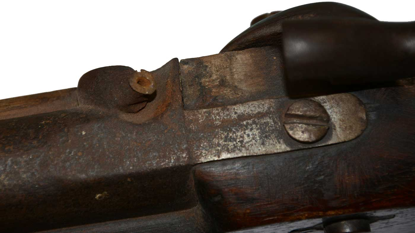 This has a full-length stock and barrel, with all bands, swivels and ramrod in place. The front sight is in place, but the rear sight is gone, not uncommon on Enfields since it was merely soldered in place. The gun has a good, untouched look, with the barrel, bands, rod and swivels showing brown and the brass mounts- nose cap, triggerguard, lock-screw escutcheons and buttplate – showing a dark, aged patina. The barrel shows generally smooth metal from muzzle back to the breech, but shallow pitting to the breech and bolster, and some bleaching to the wood around the lockplate near the bolster. The last two factors are sometimes attributed to careless use and handling by a veteran around the farm after the war, and this one does show little rifling left in it, a battered nipple, and dusty bore, but they more likely result from wartime use of imported British “high-pressure” percussion caps that were intended to better ensure ignition, but were eventually withdrawn from British service because of complaints about their excessive power and on a Confederate-used gun are good diagnostic features. The lockplate marks are sharp- a British crown at rear and “1862 / TOWER” forward of the hammer, along with the “M&H” stamp noted above, along with standard border lines along the lockplate and a floral decoration along the nose of the hammer. The corrosion from the percussion caps has affected the upper portion of the barrel proofs, but the lower mark is visible and the first “24” above it is both visible and clearly legible as “24,” which is itself a fairly scarce Enfield bore measurement. The mechanics are good.