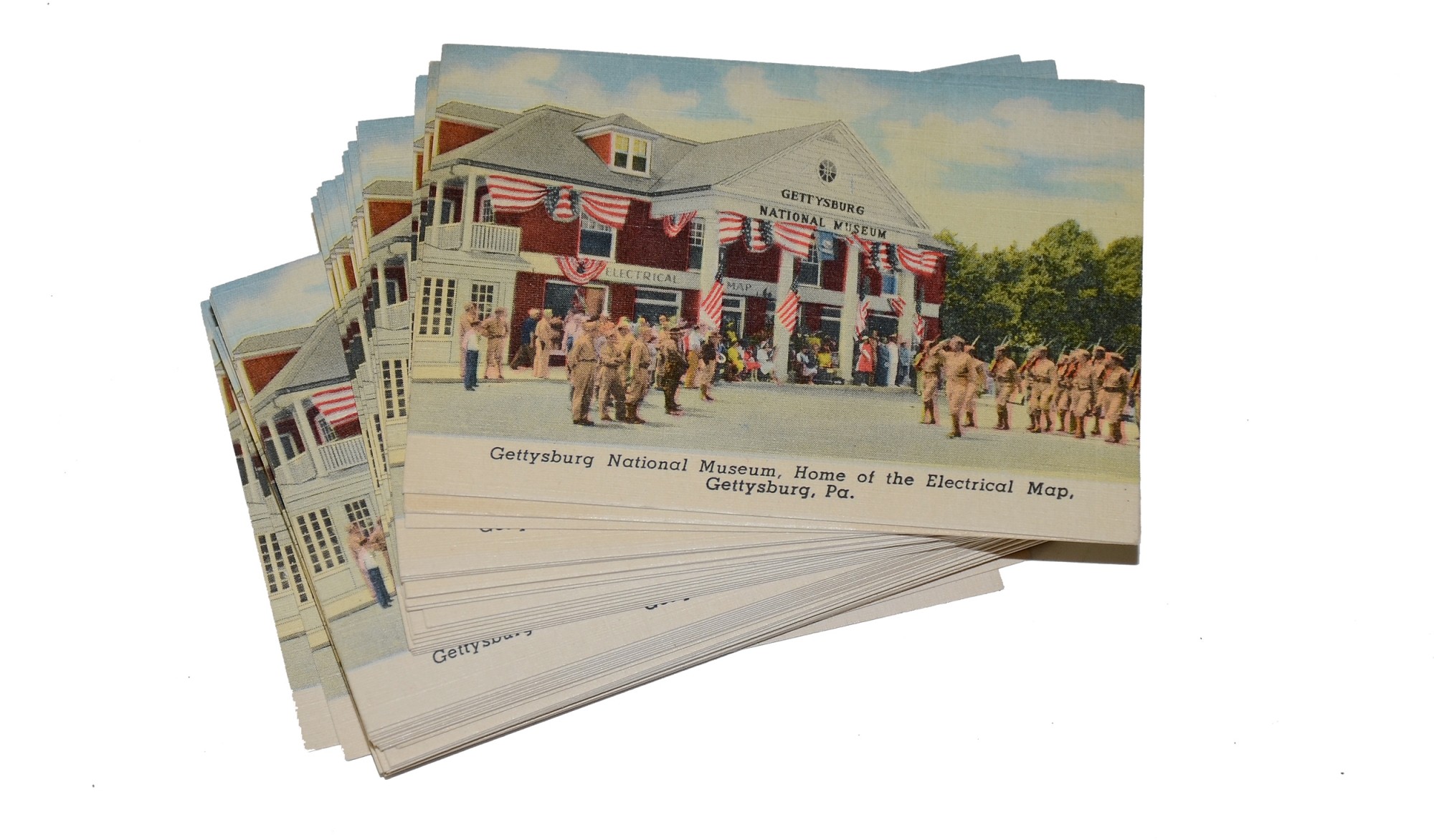 Image on card features the “Gettysburg National Museum” which was also the home of the Electric Map. It was owned by the Rosensteel family which held the collection of Gettysburg artifacts and would eventually become the NPS Visitors Center and Museum. This scene shows the parade for the original Longstreet monument dedication on July 2, 1941, with General Longstreet’s widow in attendance.