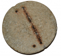 Smaller-size eagle breast plate often called the “Burnside” breast plate and associated with troops from Maine. Stamped brass face is clean and smooth with a crisp eagle stamping. Face has an even chocolate brown patina; a few small dings around the edge. Back has 100% lead fill with rust from iron wire visible, but both loops are gone. Measures approximately 60mm in diameter.