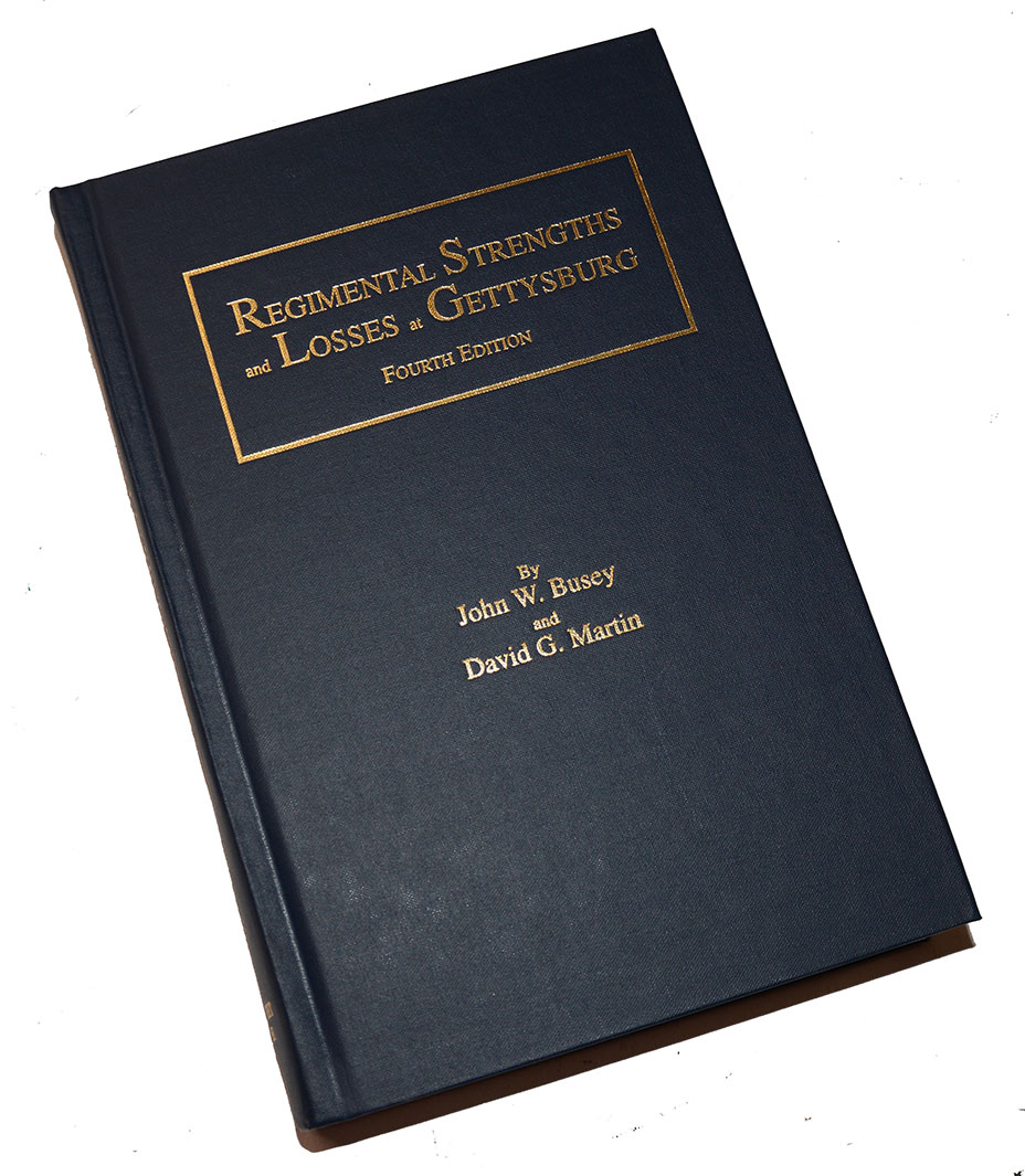 Full title of this work is “REGIMENTAL STRENGTH AND LOSSES AT GETTYSBURG -FOURTH EDITION” by John W. Busey and David G. Martin, and printed by Longstreet House Books of Hightstown, New Jersey in 2005.