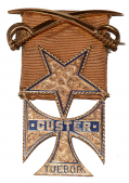 This follows the configuration of the few other known badges and Custer’s own drawing, preserved in his journals, now at the Little Big Horn Museum. The badge and pinback top bar are gold, with the top bar in the form of 1.25” crossed sabers, from which depends a gold ribbon supporting a gold and blue enameled Maltese cross 1” by 1-1/2” whose top arm is actually a five-pointed star, point down. Both the star and the (three) arms of the cross have chip-carved edges and delicately engraved dense swirls adding highlights and have blue enameled border lines. Across the center of the cross is a horizontal blue enameled bar with “CUSTER” in gold (with small gold squares at left and right) and on the bottom branch the bottom blue border is above the edge of the badge, with “TUEBOR” (the Michigan state seal motto- roughly, “I WILL DEFEND”) in blue enameled letters. The reverse of the medal is engraved, “GEO. G. BRIGGS. / 7th MICHIGAN CAVALRY” in thick block letters for the name and thinner letters in curving lines with flourishes for the unit. The condition is excellent.