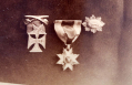 The fourth badge in the group is not shown in the photograph, but was part of the original group of memorabilia sold by the family in 2013. The badge consists a of long yellow silk ribbon embossed with gold crossed swords poking up through a horseshoe bearing a sunburst glory along its outer edge. This is suspended from a pin back, five-branched cross or “quinque-foil,” of gold with blue enamel center showing a gold edge to the branches of the cross and a gold “7” at center, marked on the reverse, “R. STOLL N.Y. / SOLID GOLD,”