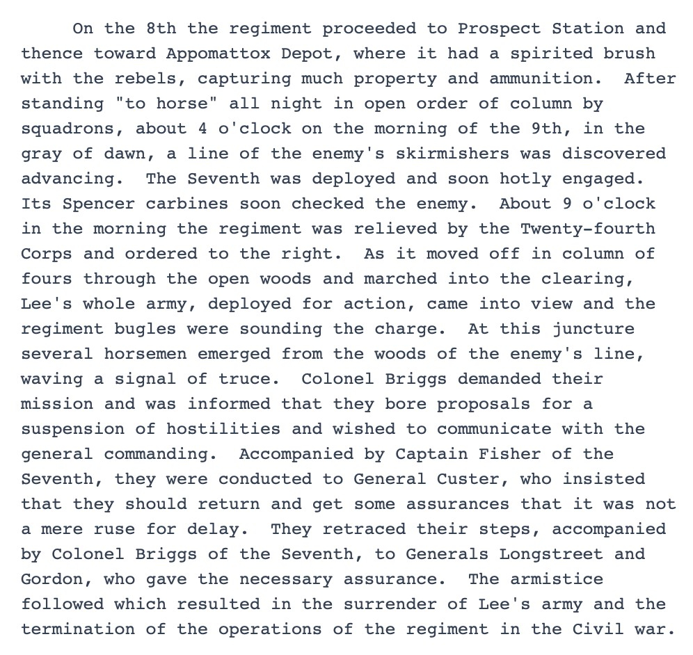 A summary, but still lengthy account of the regiment’s service can be found in “Record of Service of Michigan Volunteers 1861-1865.” We show the synopsis from Dyer’s Compendium. Briggs was born in Michigan in 1838, the eldest of four sons and was raised in Wayne and St. Joseph Counties before moving to Battle Creek, where he attended public school and then worked as clerk and a bookkeeper in a mercantile company in Illinois, with a brief stint at Olivet College in between. He returned to Battle Creek to become part of Averell, Briggs & Co. until the war began and he recruited a company for the 7th Michigan Cavalry, mustering in as 1st Lieutenant of Co. A in October 1862, rising to Regimental Adjutant as of July 1, 1863; to Captain, Co. A, on March 22, 1864; Major on May 19; Lt. Colonel on October 12, 1864; and Colonel as of May 26, 1865. He was captured October 19, 1863, at Buckland’s Mills, Va., but escaped two days later, and on April 1, 1865, was wounded in the left leg at Five Forks, but stayed in the field with the regiment. After the Grand Review at Washington in May 1865, the regiment was sent west to the Department of Missouri and Department of Dakota, seeing some service in the Powder River Expedition.