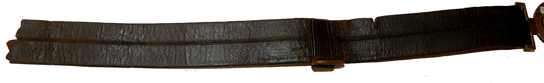 This has been mounted for display on a correct period replacement belt that looks perfect for it in construction and condition. It is fairly plain and looking very much like a Confederate or prewar militia officer’s belt, made of folded black leather, oxidized slightly toward brown, 1-5/8” wide with just an impressed border line running along the top and bottom edge for decoration. There is an oval brass wire loop for suspension of a forward sword sling sewn the bottom edge of the belt on the wearer’s left. The rear sling was probably on a sliding loop, now missing. The belt was adjusted by a narrow oval brass frame and tongue buckle fixed to the other end of the belt, which passes through the belt loop for the tongue portion of the plate. The belt is missing the slings, but retains its sliding tightener, shows some stiffness and cracking, a partial tear through one of the adjusting holes about 6 inches from the plate on the wearer’s right and a few inches beyond that a break, but no missing leather, on what would be the wearer’s right rear. All of this seems perfectly in keeping with Cook’s account of the belt coming off Hodges’s body, his own use of it later, and what the original probably looked like in the hands of the family after it was returned to his widow and deemed not worth preserving, in contrast to the elegant beltplate and embroidered colonel’s stars.