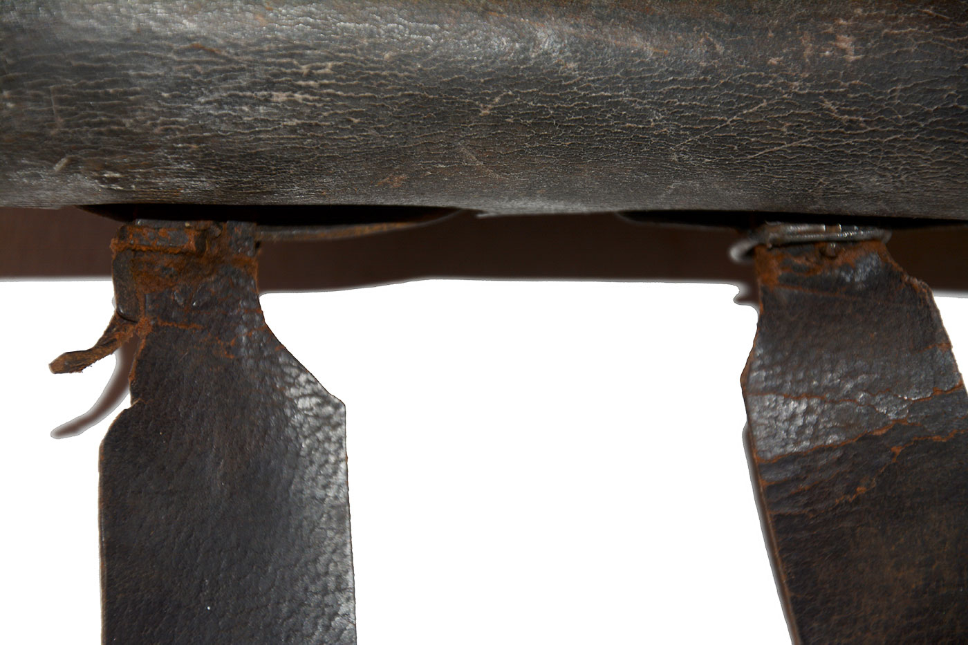 The “make do” leather shoulder strap is fashioned from four separate pieces tied together with leather strips. This is connected to the loops on the back of the box; one side is tied and the other by a small iron buckle.