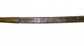 The dark colored steel scabbard has a very worn appearance with much finish loss. The throat and mounts are of plain brass with a dotted line edge decoration. The two mounts have their rings but the lower ring mount wiggles a bit. Drag is plain. All brass is dark. Throat is engraved “PRESENTED TO P. G. CHAS. HANNABERY BY THE MEMBERS OF HENEOIS ADOLPHUS LODGE N0. 28 L.O. OF O.F. PHILADA. OCT. 3, 1861.”