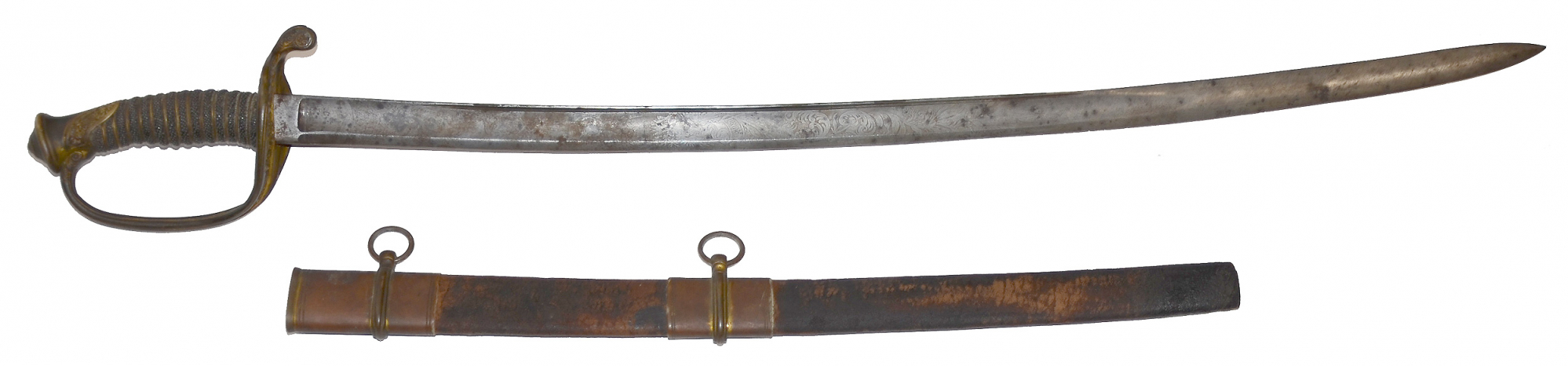 A Model 1850 Foot Officer’s sword with most its leather scabbard. Blade is an import from Solingen, Prussia (now Germany) and was assembled by Philadelphia jeweler George W. Simon. Listed as “Geo. W. Simon & Bro.” during the Civil War was a jeweler and sword mounter with business located on Sansom Street in Philadelphia. Simon assembled swords using both imported and domestic blades with his company name etched on the ricasso.