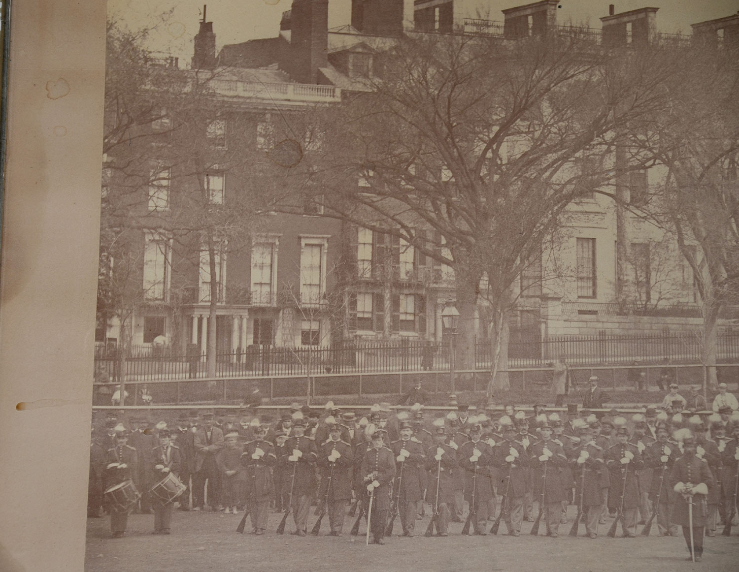 This large format outdoor albumen photograph has great clarity and tones, and lots of detail to draw one in. We have firmly identified the spot as the Boston Common: the same buildings in the background of the photo stand today. Drawn up in the middle ground is company of infantry, militia or national guard, with their colorbearer at center and two platoons drawn up in line at parade rest. The three company officers and the first sergeant have stepped to the front. Officers and men wear white gloves, with the exception of the officer at center front, likely the commander, who wears gauntlets. All four seem to carry 1850 foot officers’ swords. The colorbearer, carrying a United States flag, is positioned at center in the front rank with a corporal on either side of him, probably making up the colorguard. Corporals on the flanks of the front rank and to the left of the colorguard delineate two platoons. Sergeants are likely behind the rear rank as file closers. Also to the viewer’s left stand two drummers. To the sides and rear stand civilian onlookers, mostly men and boys, though three women are prominent in the center rear behind a railing and a couple of others can be picked out in the crowd.