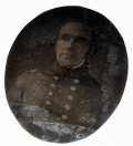 The uniform also would be a problem for that identification. The large rounded buttons, the button arrangement, and lay-over collar, in fact, suggest we are looking at a Navy officer. The Register of Officers of the Confederate States Navy, 1861-1865, yielded no candidates, but a prewar US Navy officer would be very possible and the plain shoulder straps could be those used to indicate a Master from 1852-1858 (according to Todd,) which would fit our impression of the date. Our best candidate meeting those criteria appeared to be Charles Carroll Carpenter, who had a great record, rising to rear-admiral, and was a Midshipman in October 1850, Passed Midshipman in 1856 and Master in 1858. Our champagne bottles, however, have remained corked. We get no Kentucky connection for him; our man looks just too old for him: C.C. Carpenter was born in 1834, making him only 24 in 1858; and, he was literally for just one day- moving up from Passed Midshipman to Mate 1/22/1858, and then to Lieutenant 1/23/1858.