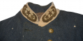 The frock exhibits 2 large holes caused by enemy projectiles. One has carried away the fourth from the bottom right Virginia staff button but amazingly leaving its shank intact! The other a several inches away to the right and down of this must have pierced ("struck") his leather belt before tearing a hole in the material of his uniform. In Hunton's autobiography he addresses his brush with death more prosaically when writing about the last days of the Petersburg defense March 31, 1865. He states, "I had three (sic) bullet holes through my cloths in the fight. One bullet went through my flannel shirt. Its direction was changed by my sword belt which it pierced. Another struck my scabbard and bent it nearly in double. When I reported to General Lee, he looked at my cloths all torn by bullets and said: "I wish you would sew those places up. I don't like to see them," I said, "General Lee, allow me to go back home and see my wife and I will have them sewed up. He said, "The idea of talking about going to see wives; it is perfectly ridiculous, sir"; and was rather amused at it"