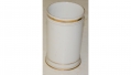 English Delft ceramic jar features gold gilt bands, the caduceus symbol and a cartouche label flanked by flowers that reads, “BALS: ARCOEL”. Jar has one small chip on the side of the top rim. Gold gilt and label have worn in areas.