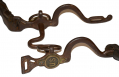 Iron bit is the 1863 Artillery model. Side “cheek” pieces have brass “US” medallions riveted in place. Mouth piece (port), cheeks, and rings are in place. The bottom cross bar is missing. “US” is stamped on the port and one of the cheek pieces.