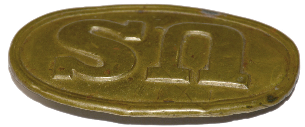 This is a good, non-excavated example showing wear and use, but with a medium patina showing just a little discoloration at a couple of spots around the rim, at lower left and right, and upper left, along with small handling marks and some dings mainly at top left, resulting in some unevenness to the fill on the reverse. There is one small spot on the reverse that looks like it was struck by something pointed that did not penetrate, but raised a tiny dot on the surface to the lower right of the “U.” The arrowhead stud and belt hook are firmly in place. A narrow brass line nicely shows the construction, using a one-piece brass element secured by the lead solder fill. This would fit nicely in a military belt plate collection or a display focused on the Mexican War, though these plates also made their way into the Civil War on the equipment of early war volunteer forces from the various states. [SR][PH:L]
