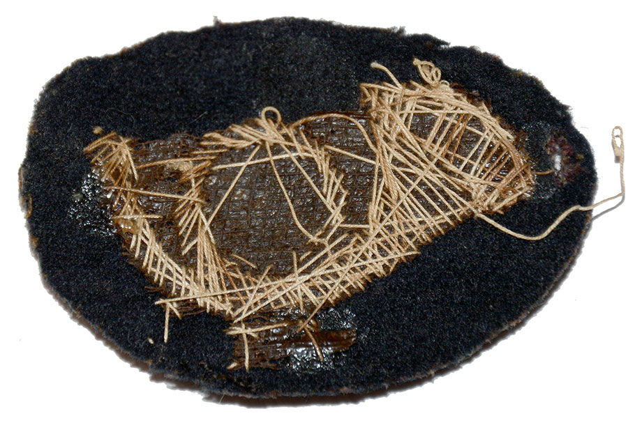 The reverse shows the cotton threads of the embroidery which remain intact although discolored. There are three spots of modern adhesive where it appears a modern collector either attempted to strengthen the item or it was done in an attempt to mount the item to be displayed in some way. [cla] [ph:L]