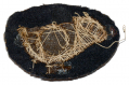 Just over two inches from end to end, this small pattern 1858 infantry horn insignia made of gold bullion is backed on wool felt. There is a small tear near the horn on the upper lefthand side. These smaller insignia are one variation on the regulation pattern 1858 infantry insignia, which was one inch larger than this smaller version. They were made in various sizes to fit different kinds of caps from chasseur’s kepis to forage caps. Although these smaller patterns were not considered regulation, they were widely used and accepted.
