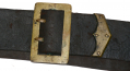 This specimen is constructed of a bridle leather belt measuring 2 ¼” wide by approximately 53” in length with hardware of a steel swivel and snap-hook device used to attach it to the carbine ring. Snap hook is unmarked. Also present is a large rectangular brass adjustment buckle and brass sling end tip. The buckle is sewn only. These slings were used extensively throughout the Civil War and well into the post-war period of the Indian wars as well. The condition of the leather is soft and supple with some crazing and loss of surface finish. The leather has been heavily treated with a leather preservative.