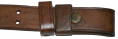 Brown leather sling with a functioning loop at one end that is fastened by a brass stud and a double pronged hook at the other.