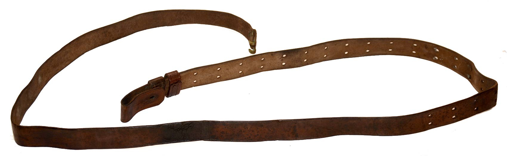 Sling meas. approx. 1.08 inches wide x 66.00 inches long and has two sliding leather keepers.