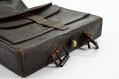 The cover uses a higher quality of leather than one would see on a government contract box and appears to have two layers, bound along the edge. The fastening tab has also been secured more thoroughly with a circle of stitching rather than the conventional single straight line. Lastly the magazine tin is one-piece rather than two. The other elements, such as the implement pouch on the front and the use of loops and buckles for a shoulder belt only are typical of the 1839 boxes supplied to the government.