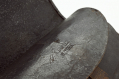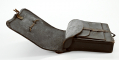 The condition is very good. The latch tab is broken below the fastening hole, which is not unusual. Both buckles are present, though the narrow billets securing them show losses and are partly loose. The finish is nice, with good color and just minor rubs and scrapes and some white spots on the inside of the flap from the fatty deposits of the leather. The original 1839 pattern cartridge box plate is in place, held by an old, if not the original, thong. We have not tried to remove the plate to check for markings.